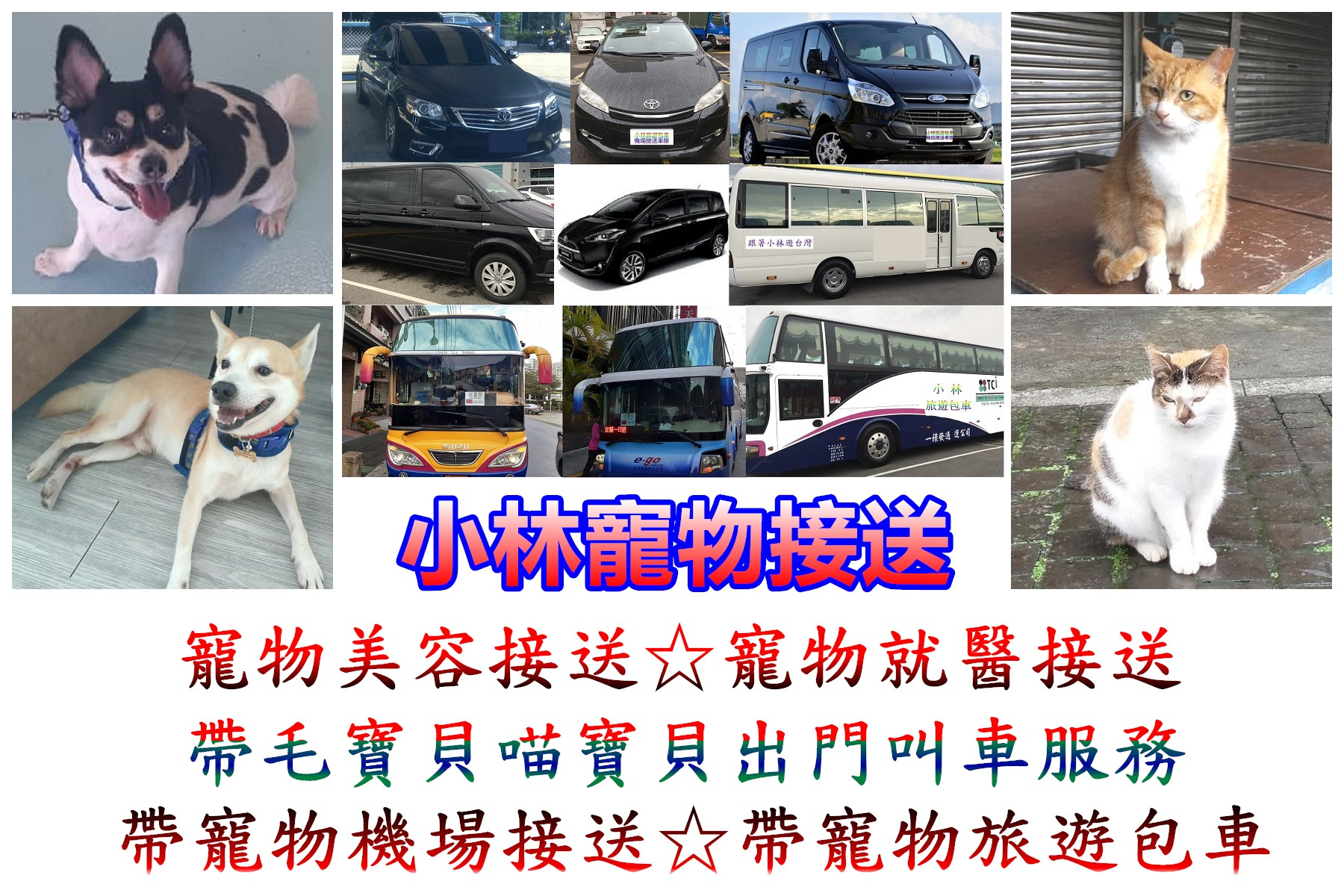 小林寵物接送車隊全年無休提供台北.新北.基隆.桃園出發寵物美容接送、寵物就醫接送、帶寵物出門叫車、帶寵物出國叫車去機場回國接機、寵物旅遊包車服務。我們提供轎車、休旅車、商務車、21座中巴、27座大中巴、45座遊覽車提供您寵物接送服務!